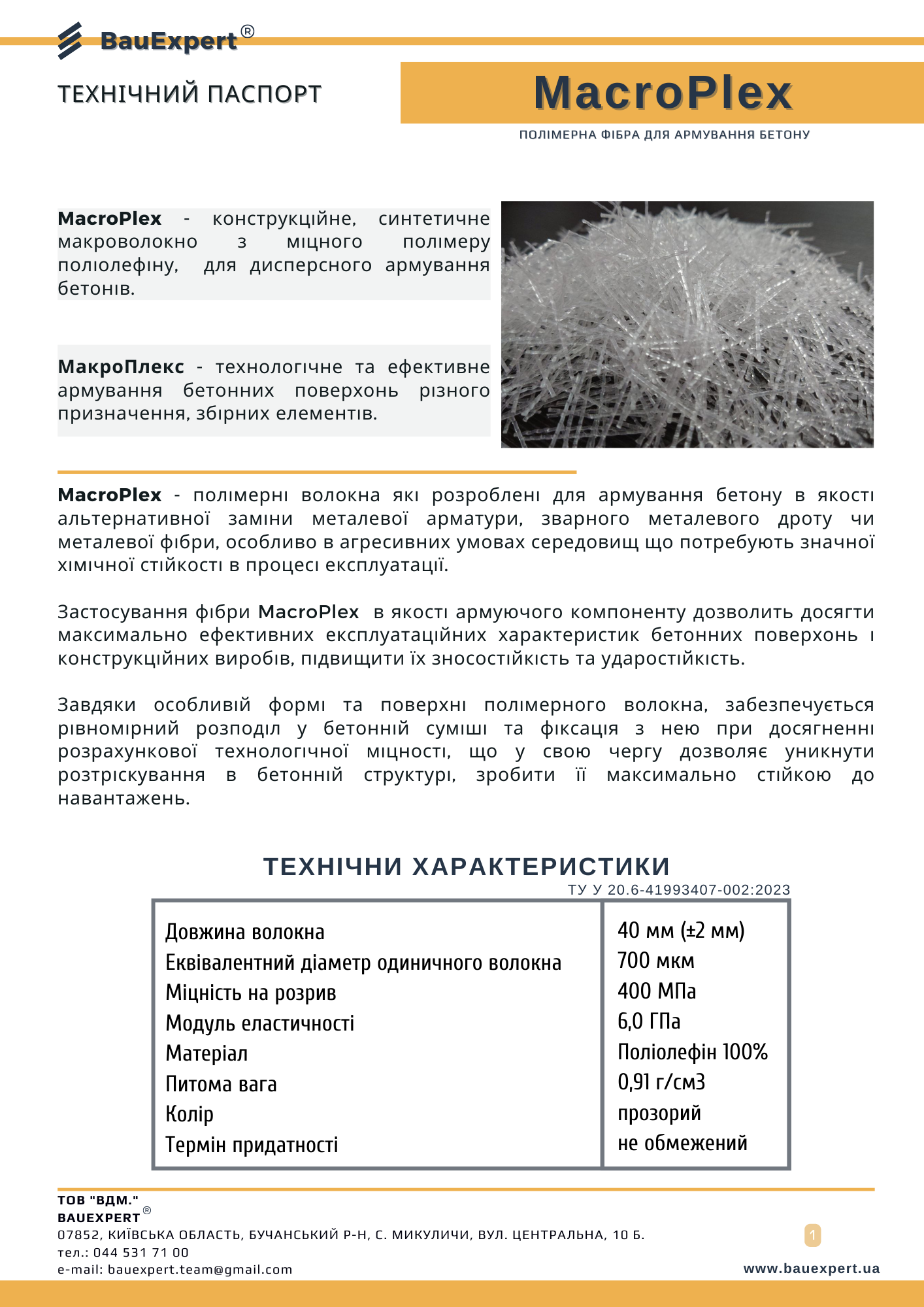 MacroPlex – это конструкционное синтетическое макроволокно из прочного полимера полиолефина, предназначенное для дисперсного армирования бетонов.