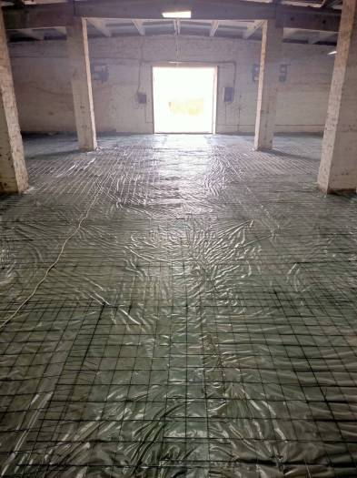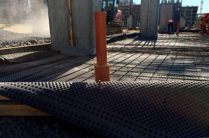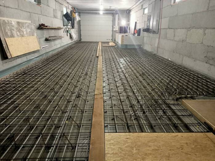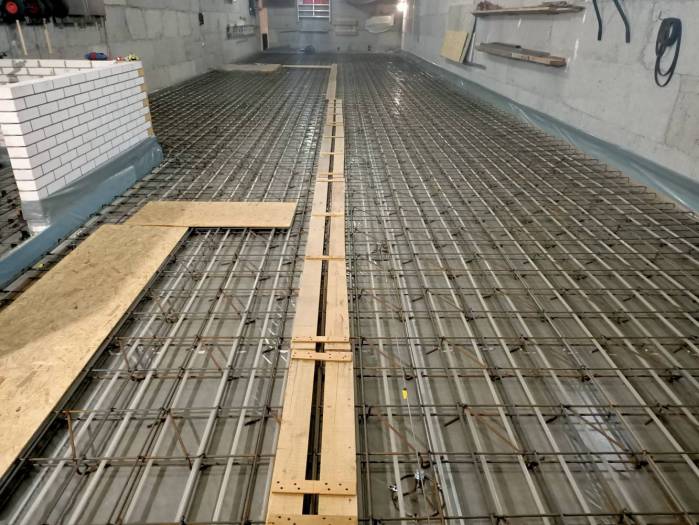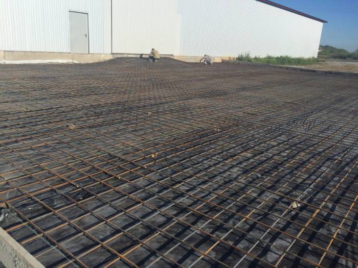 В первую очередь укладывается гидроизоляционная пленка. Затем вяжут арматуру, формируя жесткий каркас (укладывают армосетку), и устанавливают опалубку. Когда работы завершены, высчитывают объем бетонной смеси, подлежащей укладки. После заливки бетон нужно провибрировать глубинными вибраторами. Если толщина стяжки слишком мала, используют виброрейки. Это необходимо, чтобы из массива удалить воздух, что избавит от появления раковин.